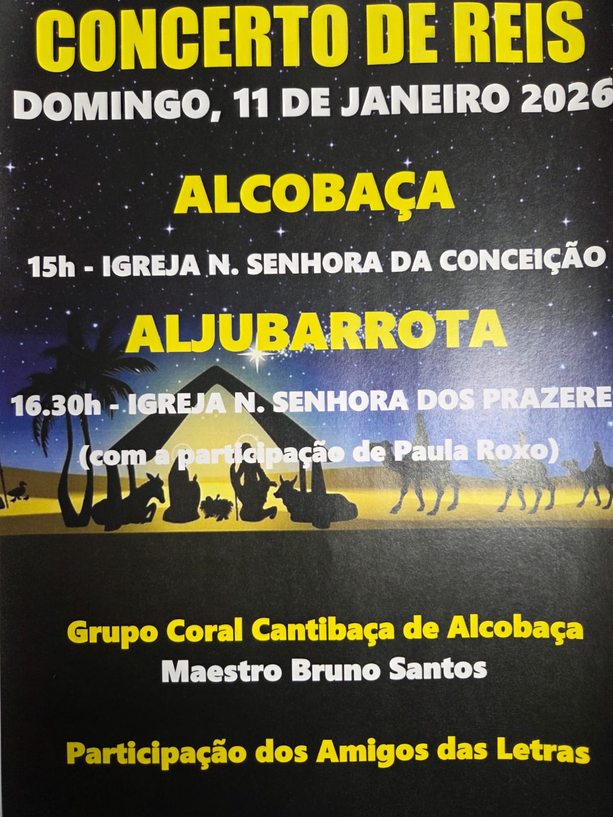ALCOBAÇA 15h - IGREJA N. SENHORA DA CONCEIÇÃO ALJUBARROTA 16.30h - IGREJA N. SENHORA DOS PRAZERE (com a participação de Paula Roxo) Grupo Coral Cantibaça de Alcobaça Maestro Bruno Santos Participação dos Amigos das Letras